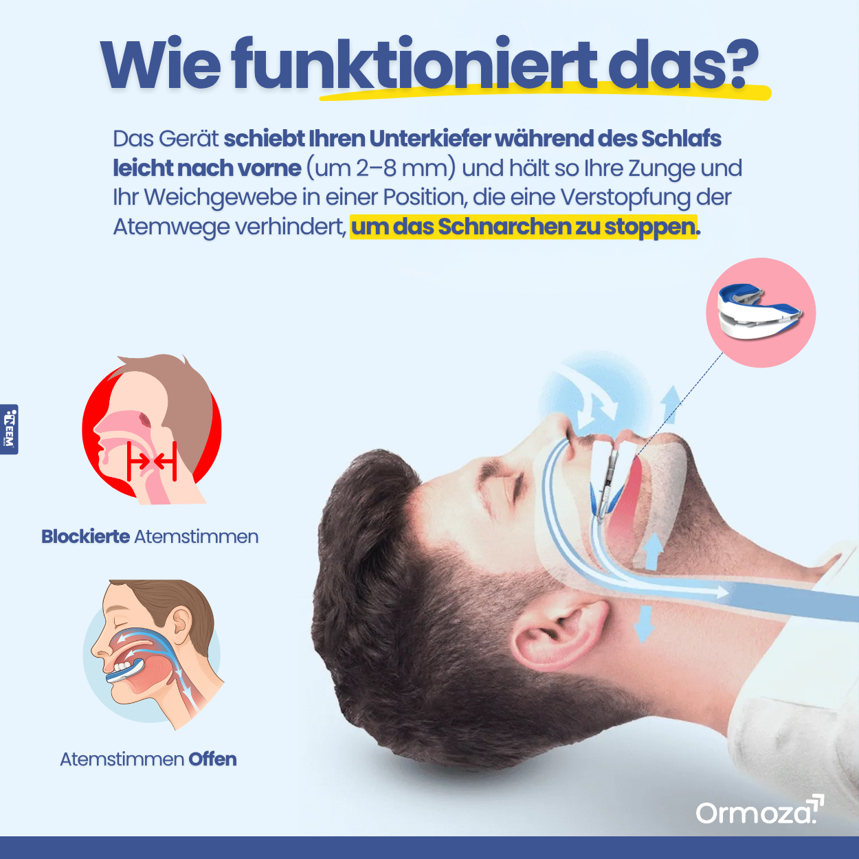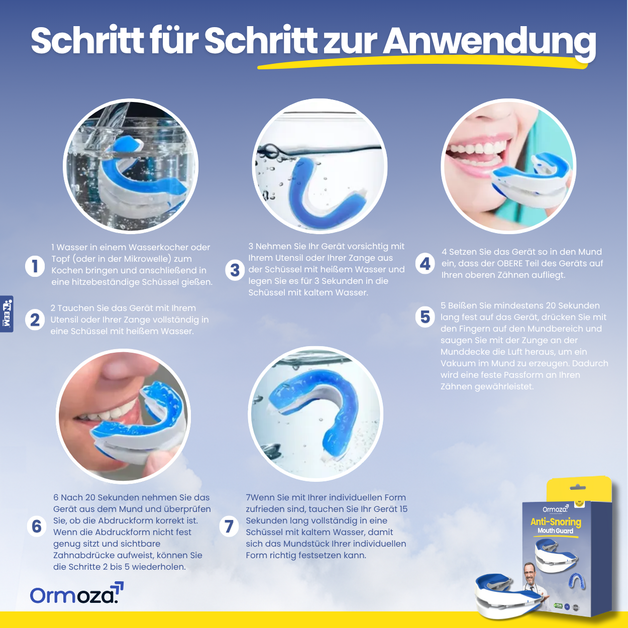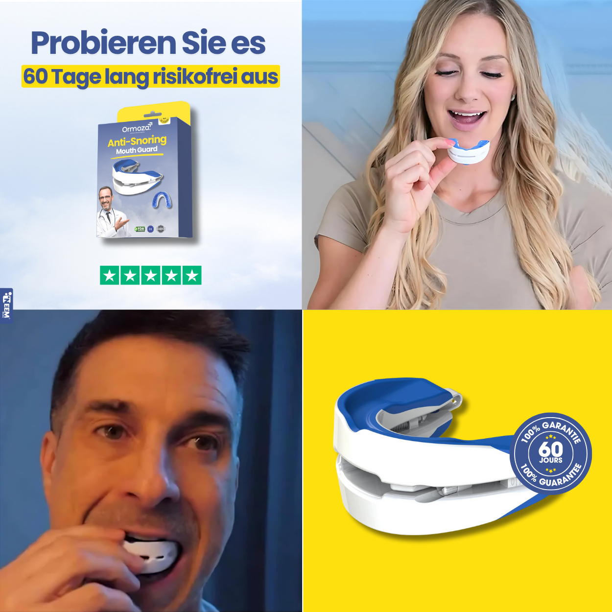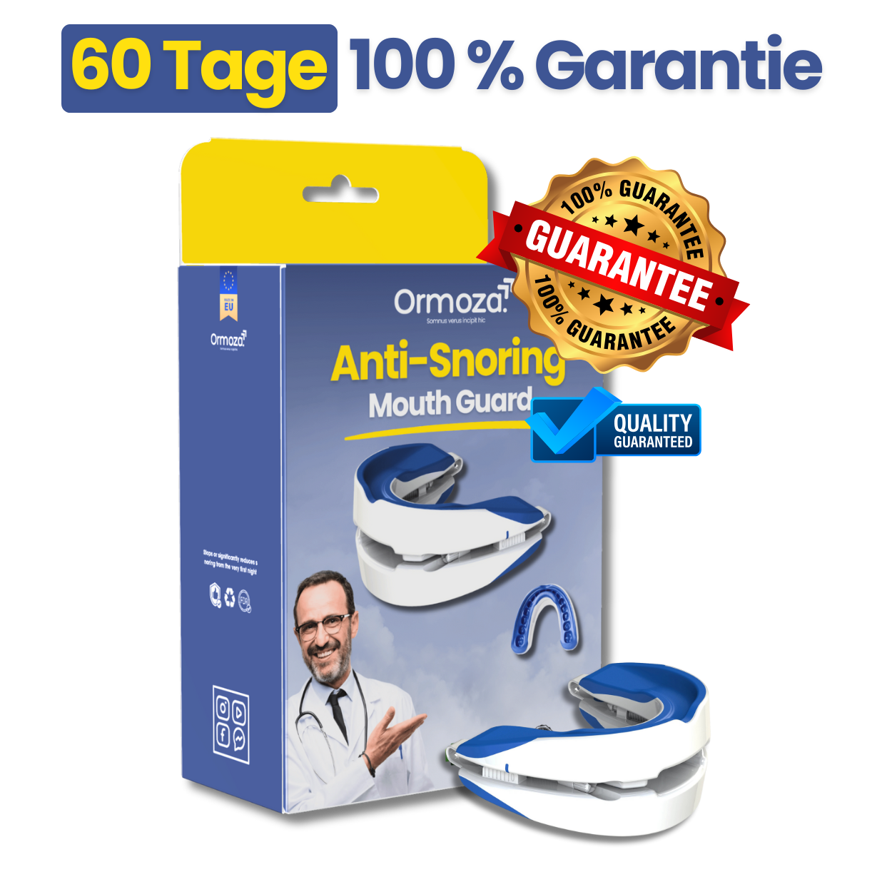Ormoza™ ist speziell für nächtlichen Komfort entwickelt. Das weiche medizinische Material passt sich nach der Anformung perfekt an Ihren Mund an. Die meisten Benutzer gewöhnen sich in 2-3 Nächten daran. Bei Beschwerden können Sie es neu anformen oder unsere 60-Tage-Garantie nutzen.