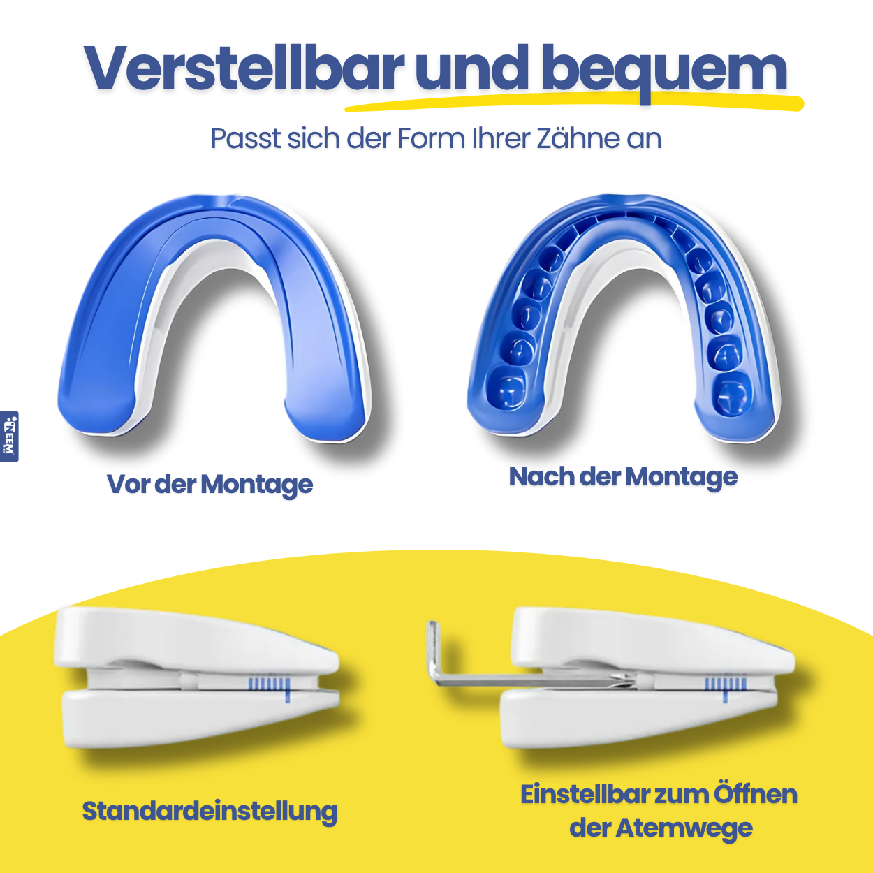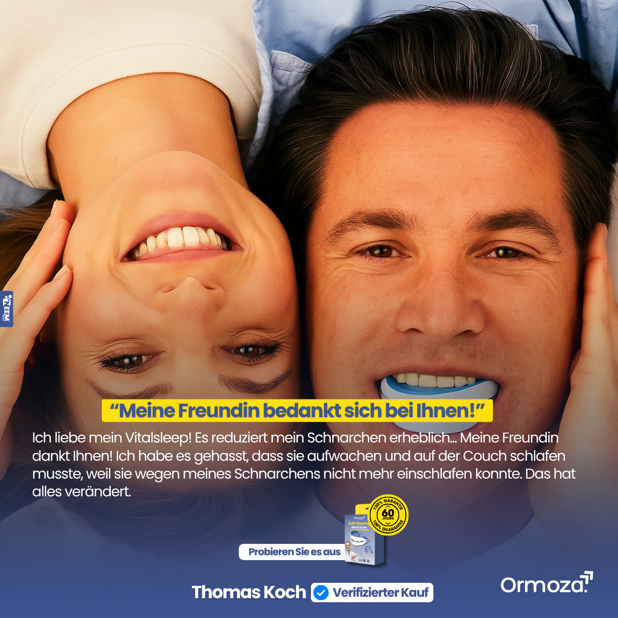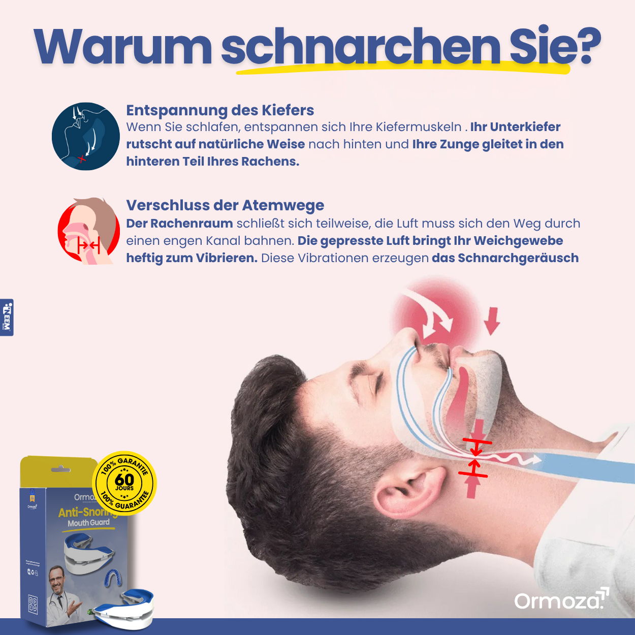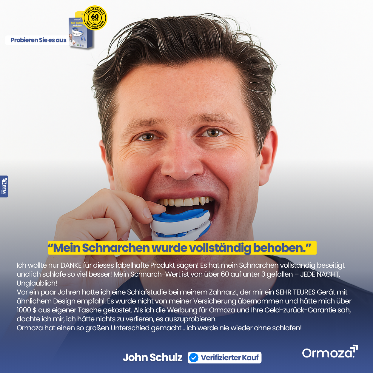 Ormoza™ ist speziell für nächtlichen Komfort entwickelt. Das weiche medizinische Material passt sich nach der Anformung perfekt an Ihren Mund an. Die meisten Benutzer gewöhnen sich in 2-3 Nächten daran. Bei Beschwerden können Sie es neu anformen oder unsere 60-Tage-Garantie nutzen.